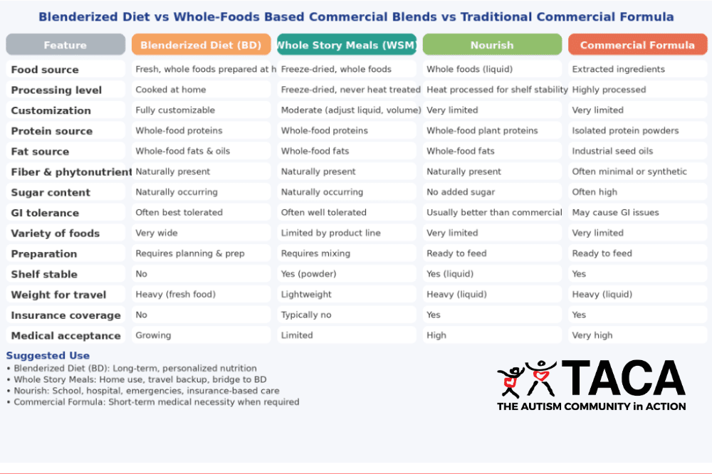 TACA encourages autism families to prioritize fresh, whole food ingredients whenever possible, using a blenderized diet as an opportunity to fully move away from processed foods a child may have been self-limiting to and replace them with nourishing, whole-food options, while respecting that different families may follow different paths.